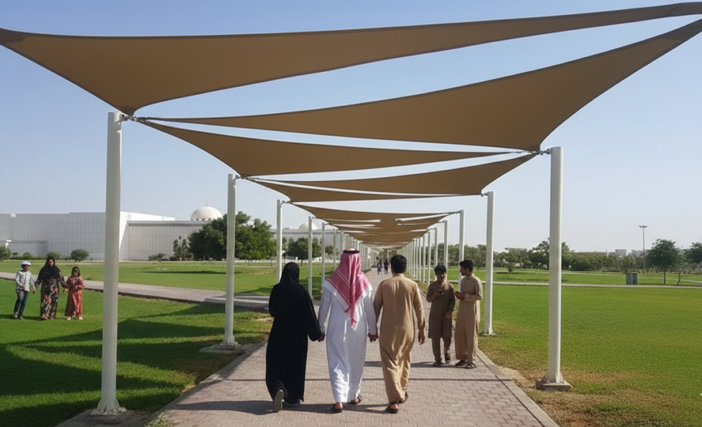 مظلات الشد (Tensile) هياكل تعتمد على تقنيات الشد الهندسي المتقدم. تتميّز بخفة الوزن والقوة العالية والتصميم المعماري الجذاب. مناسبة للمساحات الكبيرة والمشاريع الحديثة.